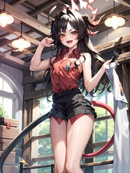 プロンプト: 手首より長い袖、短いショートパンツ、牙、実験着、悪魔の尾、サンダル、前髪、長袖、尾、コート、赤いショート、ショートパンツ、アホ毛、角、長い髪、白いコート、髪の毛の流れ、黒髪、襟付きシャツ
