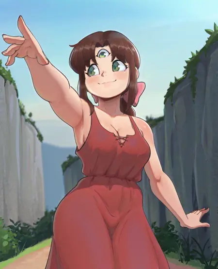 외모: P4rv4t1, 1소녀, 갈색 머리카락, 긴 머리카락, 폴타일, 측면 머리카락, 머리카락 리본, 녹색 눈, 제삼의 눈