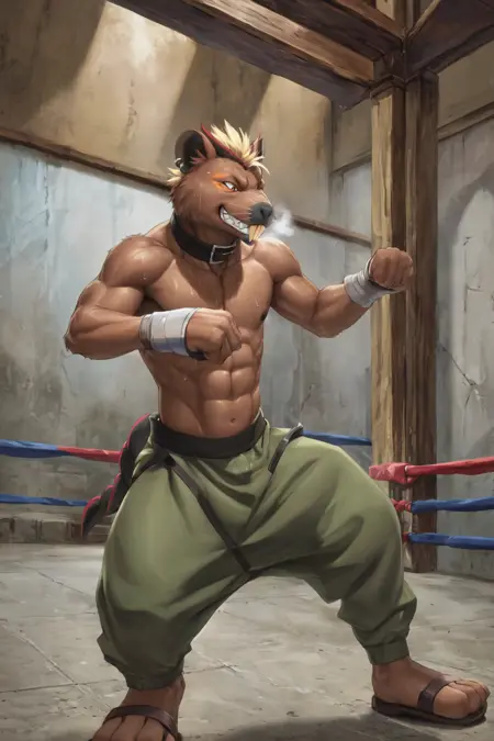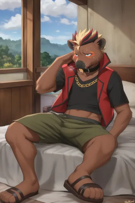 reinforcement: buckteeth, clothing, clothed, buckle collar, red vest, black shirt, bracelet, gold chain, green pants, segmented tail, sandals