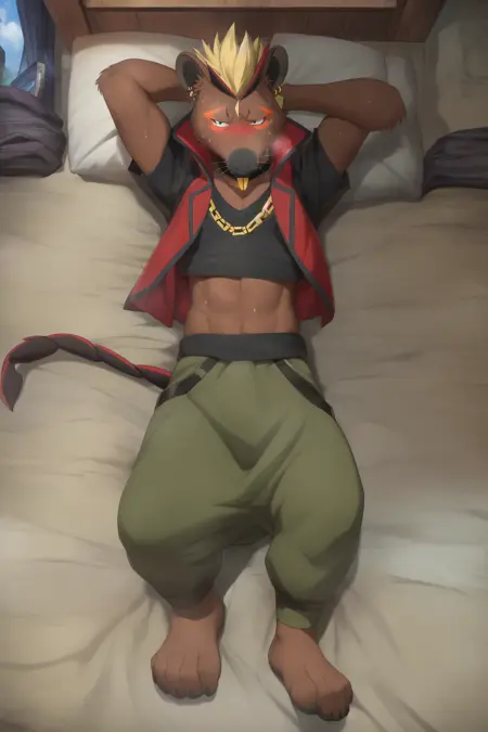 Optional: buckteeth, buckle collar, red vest, black shirt, bracelet, gold chain, green pants, segmented tail, sandals