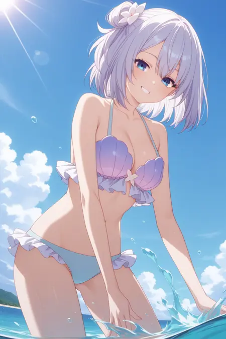 aasakuna, blue eyes, white hair, one side up, sakunaswim, swimsuit, hair flower, bikini, frilled bikini, shell bikini, frills, halterneck, anime coloring,