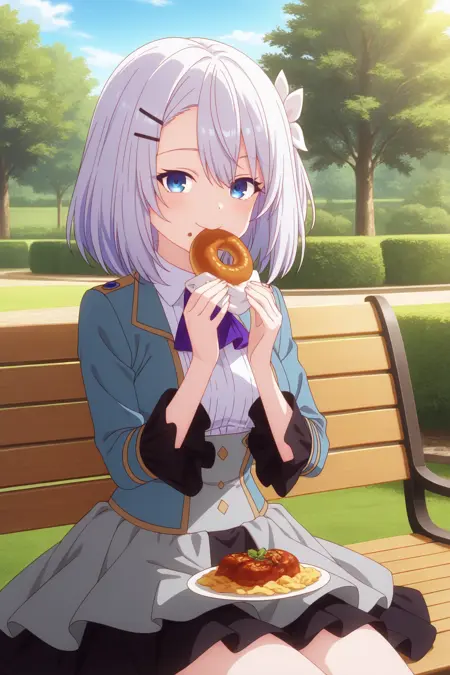 aasakuna, blue eyes, white hair, sakunadef, hairclip, hair flower, purple ascot, white shirt, collared shirt, blue jacket, long sleeves, frilled sleeves, grey skirt, black skirt, layered skirt, frilled skirt, anime coloring,