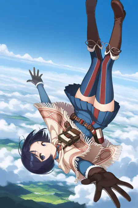 为展现她的典型形象,请添加“颈饰、米色斗篷、流苏边、蓝色上衣、褶皱裙、蓝色裙子、条纹裙、腰带、黑色手套、垂直条纹长筒袜、蓝色长筒袜、棕色靴子、及膝靴”。