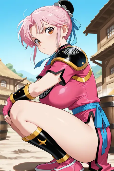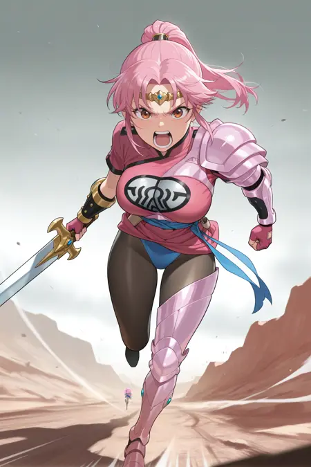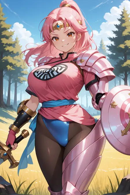 갑옷 복장을 위해 "gamrmm, 핑크 헤어, 황색 눈동자, 높은 폰테일, 긴 머리, 원형 헤어링, 핑크 갑옷, 어깨 갑옷, 핑크 튜닉, 파란 띠, 단일 장갑, 핑크 장갑, 손가락 없는 장갑, 파란 레오타드, 옷 안의 레오타드, 검은 팬티스타킹, 갑옷 다리 보호대, 비대칭 다리 보호대, 갑옷 부츠"를 추가하세요.