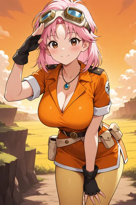 주황색 드레스를 위해 "bsmm, 핑크 헤어, 황색 눈동자, 중간 길이 머리, 고글을 머리에 착용, 목걸이, 주황색 셔츠, 칼라 셔츠, 짧은 소매, 흉부 노출, 벨트 주머니, 검은 장갑, 손가락 없는 장갑, 노란 레깅스"를 추가하세요.