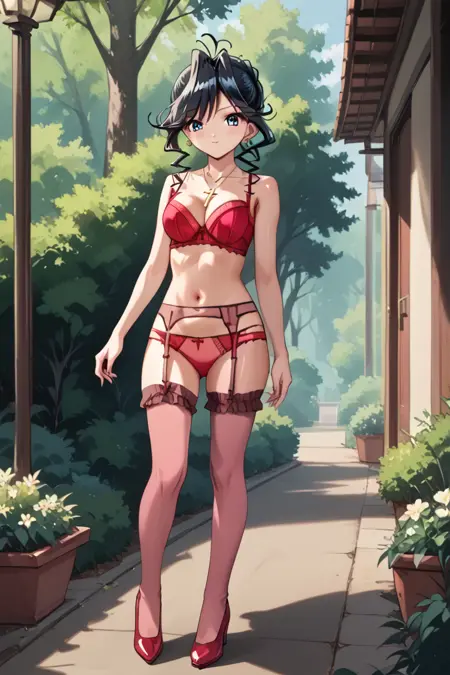 mitsuka,1girl,单人,胸部,蓝眼睛,黑发,过膝袜,蝴蝶结,肚脐,珠宝,中等胸部,内衣,内裤,耳环,项链,胸罩,仅穿内衣,十字架,内衣,吊袜带,红色过膝袜,红色内裤,红色胸罩,看着观众,乳沟,锁骨,十字架项链,粉色过膝袜,红色鞋履,全身,
