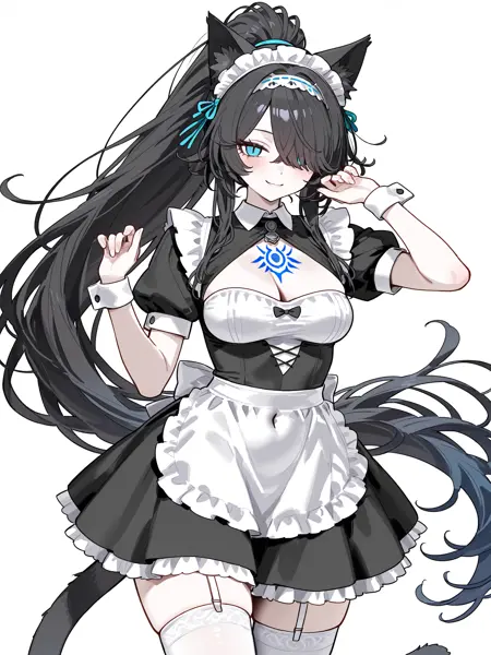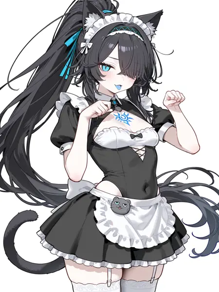 slit pupils,breasts,black long hair,cat ears,cat girl,cat tail,blue tattoo,blue eyes,hair band