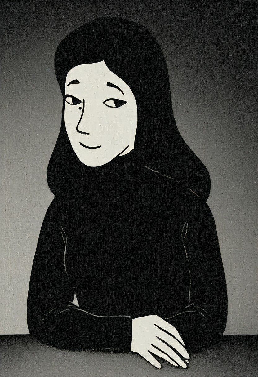 Marjane, 1girl, alone, long black hair, mole on the left side of her nose, monochrome, black sweater, black pants, black shoes
