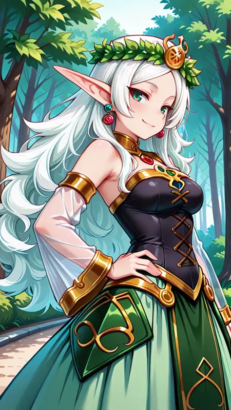 レメナラ: L3md3f, 1girl, elf, pointy ears, long hair, white hair, fluffy hair, green eyes, head wreath, earrings, detached sleeves, transparent sleeves, frilled dress, gold trim, black corset, green faulds, rose,