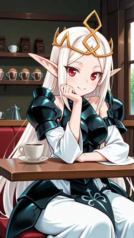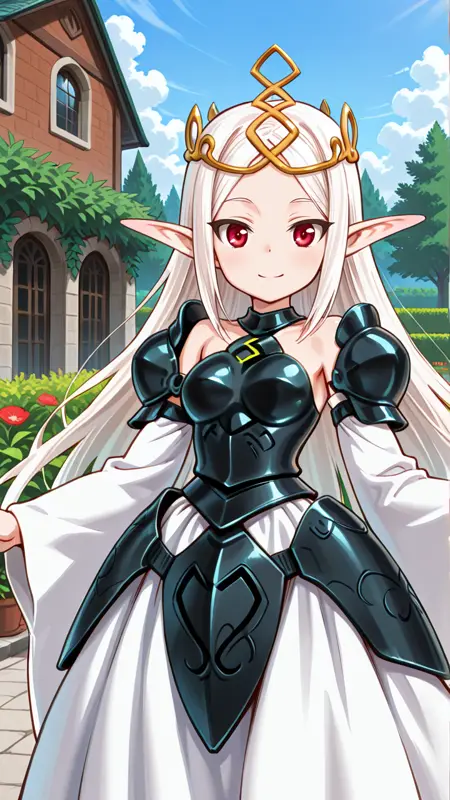 ハイエルフ: A3lfd3f, 1girl, elf, white hair, parted bangs, long hair, red eyes, pointy ears, headpiece, bare shoulders, pauldrons, detached sleeves, armored dress, frills, black armor, white dress, black faulds,