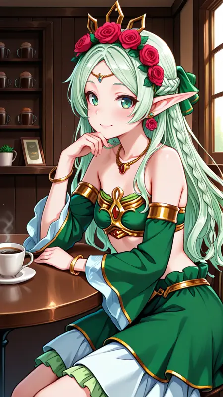 アルボネラ: 4rbd3f, 1girl, elf, pointy ears, green hair, long hair, braid, green eyes, flower hairband, tiara, head chain, green bow, hair ribbon, necklace, earrings, bare shoulders, detached sleeves, green sleeves, bracelet, green bandeau, midriff, layered skirt, rose,