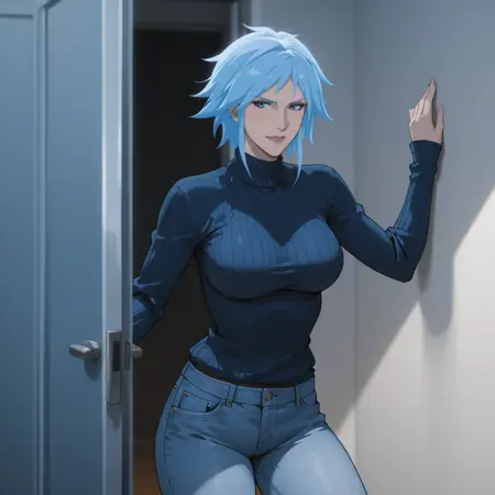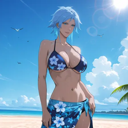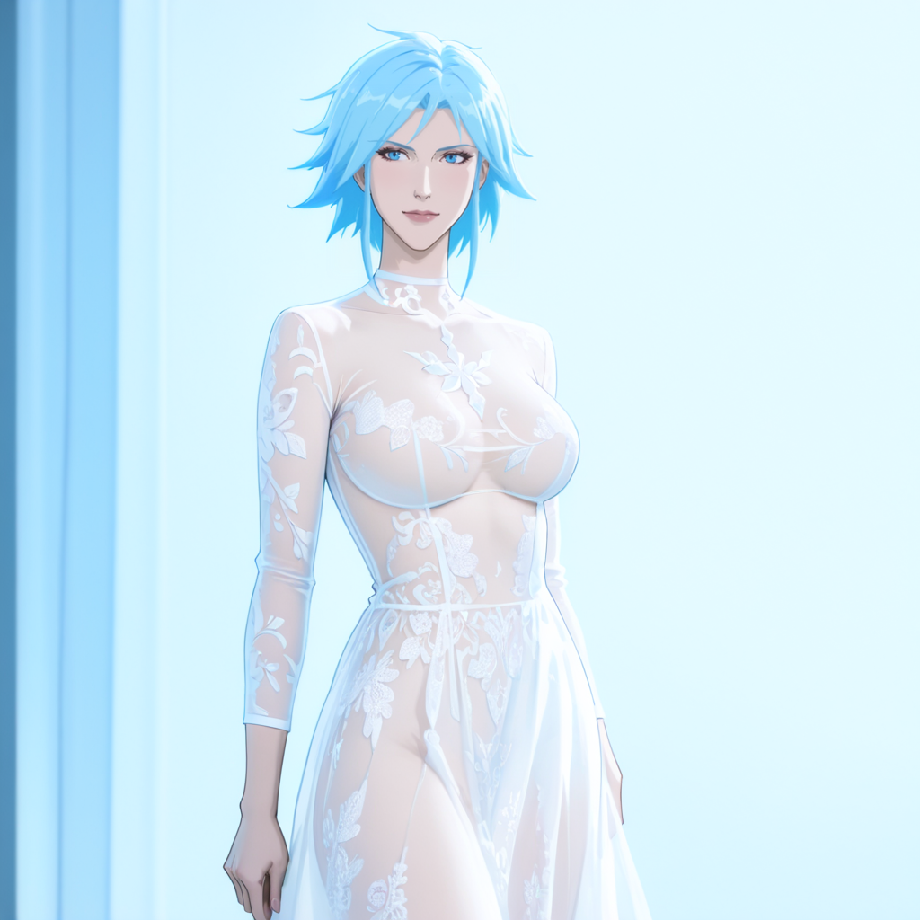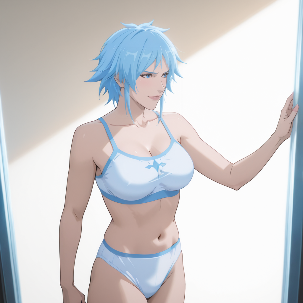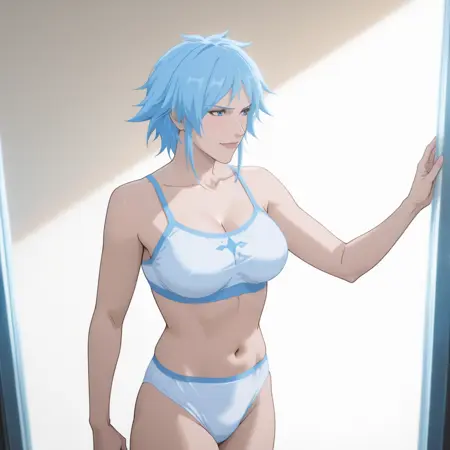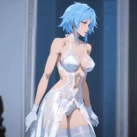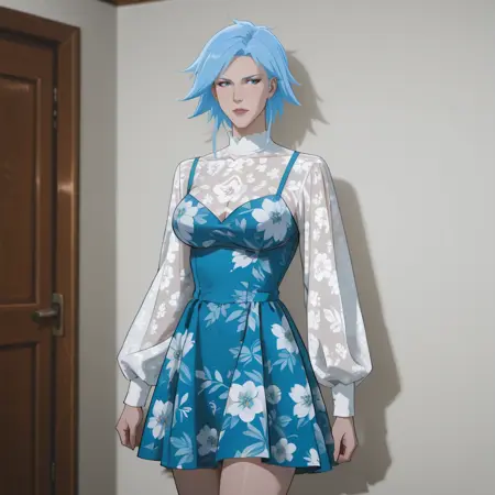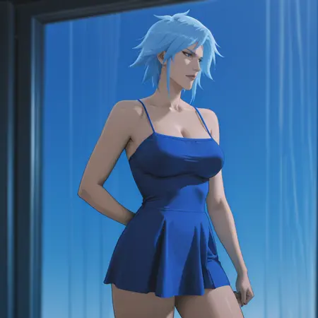 트리거: killerfrost, 1girl, 파란 레오파드, 팔꿈치 장갑, 파란 머리, 가슴, 어깨 노출, 단발
