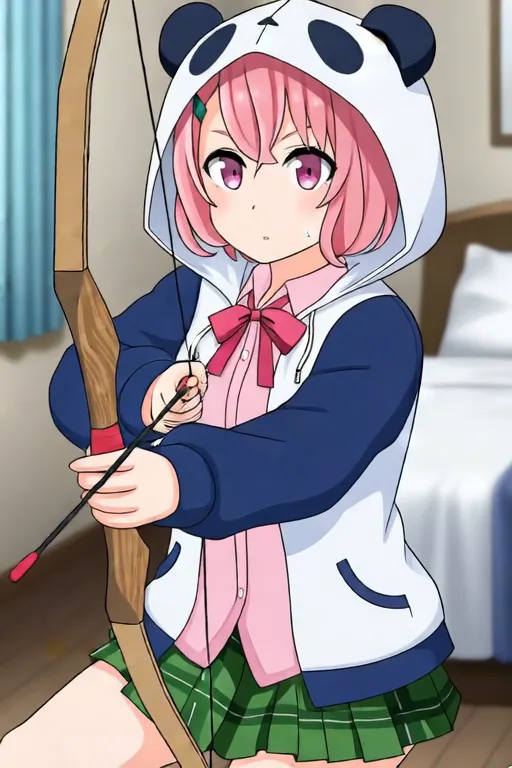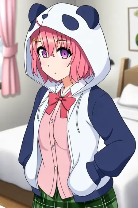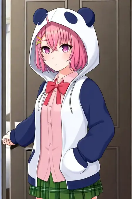 Trigger Word:Sasaki Saku, anime-style girl. The image features an anime-style character with pink hair styled in a bob cut. The character has large, expressive eyes that are a shade of pink or light purple. They are wearing a white hoodie with a panda face design on the hood, which is pulled down to cover their head. Underneath the hoodie, they have on a pink shirt with a red bow tie and a blue jacket, her outfit includes a green plaid skirt,