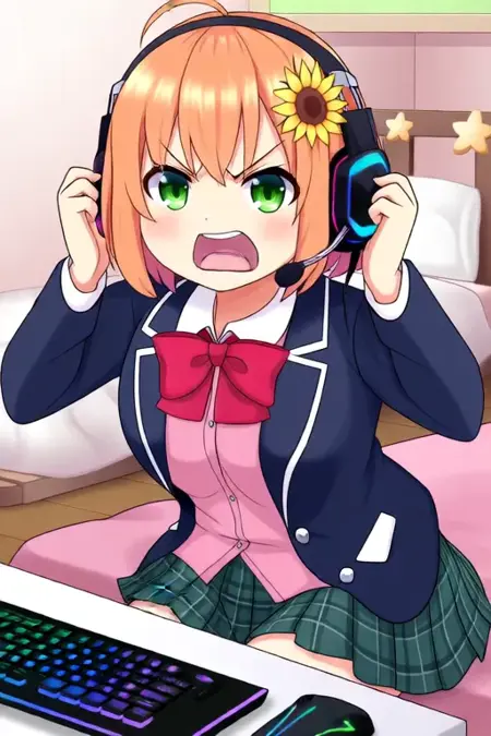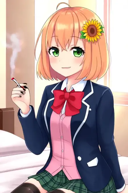 触发词:Honma Himawari,动漫风格女孩。图像展现一位动漫风格角色,拥有短发,浅橙色发色,右侧佩戴向日葵发夹。角色双眼为绿色,身着校服:深蓝色西装外套内搭粉红色衬衫,配红色蝴蝶结领结,衬衫领口与袖口有白色镶边,裙装为绿白相间的格子图案。