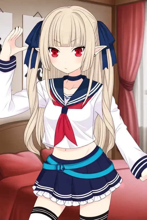 サンプルプロンプト: Makaino Ririmu、アニメ風の女の子。画像には、ライトブロンドの髪をツインテールにまとめ、それぞれに青いリボンを飾ったアニメ風のキャラクターが描かれています。髪は中央で分けられ、肩まで落ちています。キャラクターはとがった耳を持ち、エルフやファンタジー要素を持つ可能性を示唆しています。肌は白く、大きな表情豊かな赤い目が際立っています。衣装は、セーラー襟の白いブラウス、首に巻かれた赤いスカーフ、青いベルトのスカートで、スカートの裾はフリルになっており、太ももまで届くストッキングは上部に黒と白の縞模様が施されています、(彼女はダンスをしている:2.5)、(ちびネンドロイド:3.5)、寝室で。