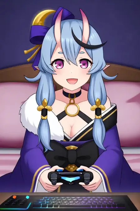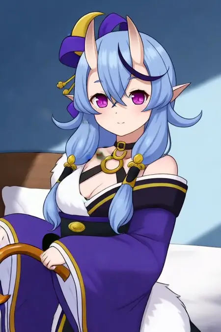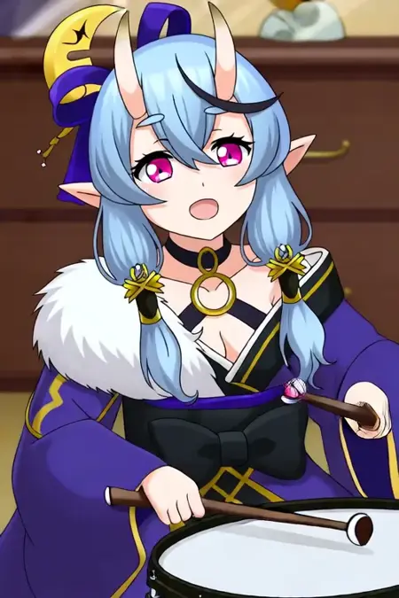触发词:Rindou Mikoto,动漫风格女孩。图像中的角色为动漫风格,拥有浅蓝色长发,分成两条马尾辫,每条均装饰有紫色丝带和金色新月形饰品。角色拥有大而富有表现力的粉色眼睛和尖耳朵,暗示其可能为拟人化生物或幻想角色。角色穿着深紫色服装,配有金色装饰,包括高领和袖口,腰间系着一条黑色皮带,配有金色扣环,以及一个黑金相间的蝴蝶结。