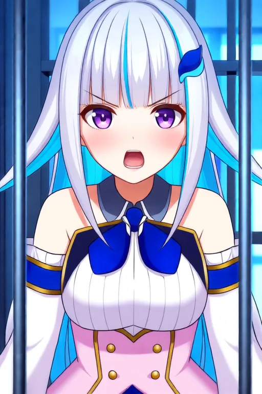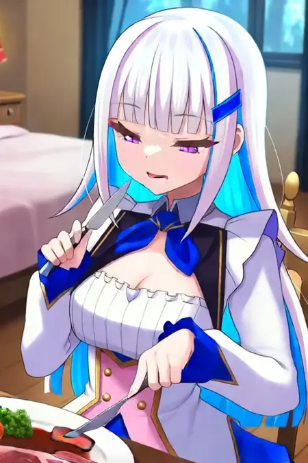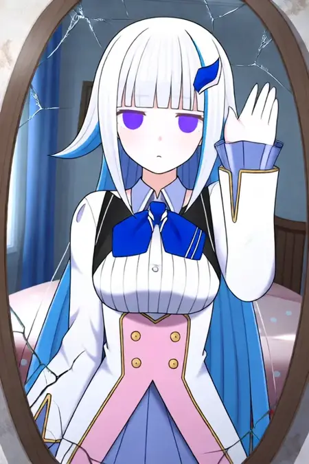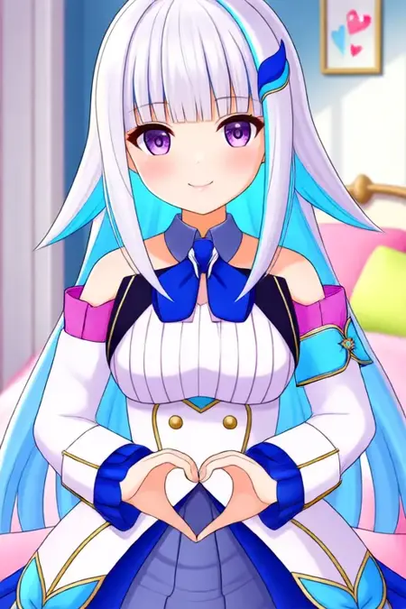 트리거 단어: Lize Helesta, 애니메이션 스타일의 소녀. 이미지는 길고 곧은 흰색 머리카락에 양 옆에 파란색 스트라이프가 있는 애니메이션 스타일 캐릭터를 특징으로 합니다. 캐릭터의 눈은 크고 보라색으로 뚜렷한 외모를 줍니다. 캐릭터는 파란색 액센트가 있는 흰색 드레스를 입고 있습니다. 드레스는 앞부분에 큰 파란색 리본이 달린 높은 칼라이며, 소매도 파란색이고 흰색 커프스가 있습니다. 옷은 금색 단추가 달린 핑크색 블라우스와 매치되는 스커트를 포함합니다.