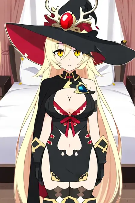 トリガー語: Nui Sociere、アニメスタイルの少女。画像には、肩より長い金色の髪をもつアニメスタイルのキャラクターが描かれており、髪はゆるやかな波状にスタイリングされ、少し乱れた印象を与えている。キャラクターの目は大きく、表情豊かな黄色で、肌色に際立っている。衣装は赤いアクセントが施された黒いスタイルで、首元に赤いリボンがついたハイカラーのトップ、黒い手袋、黒いブーツを着用している。衣装には赤いリボンや装飾的な要素が加えられ、細部にこだわったデザインとなっている。キャラクターは赤い宝石とツノが飾られた広いつばの帽子をかぶっており、その外見にユーモアのある雰囲気を加えている。マントは主に赤色で、黒い縁取りがあり、赤い宝石と装飾的なリボンが飾られた大きな広いつばの帽子をかぶっている。キャラクターの脚は黒のタイツで覆われ、ゴールドのアクセントのある黒いブーツを履いている。