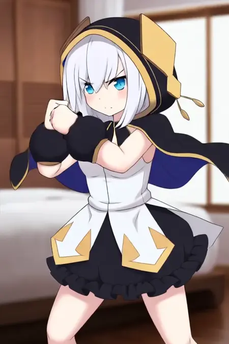 示例提示:Ars Almal,动漫风格女孩。图像描绘了一位动漫风格的角色,拥有白色头发,造型凌乱而蓬松。角色拥有蓝色眼睛,身着黑金配色的服装,包括镶金边的带帽斗篷,以及白色上衣(带有泡泡袖)、黑色荷叶边裙摆的裙子和黑色手套。角色一只手拿着一本书。 (她正在跳舞:4.0), (Q版捏捏:4.5) 在卧室中。