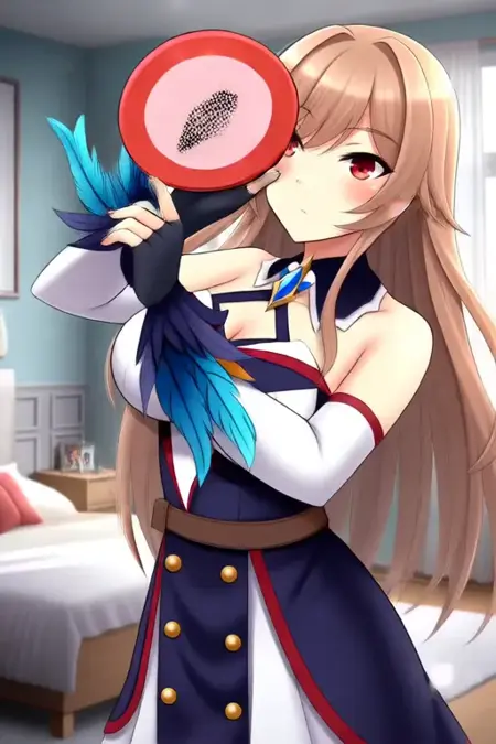 sample prompt:Furen E Lustario, anime-style girl. The image features a character with long, light brown hair that falls past her shoulders. Her hair is styled in loose waves. The character has striking red eyes, which stand out prominently against her skin tone.She is wearing a detailed outfit that includes a white top with a high collar and a deep neckline. The top is adorned with blue and red accents, and there are gold buttons running down the front. She also wears a dark blue skirt with gold buttons, which complements her overall attire. The outfit is completed with black gloves that have blue feathers attached to them. (she is dancing:4.0), (chibi Nendoroid:4.5) in bedroom.