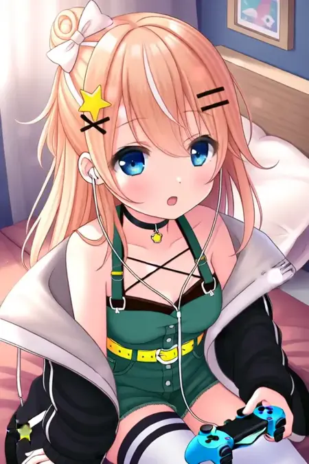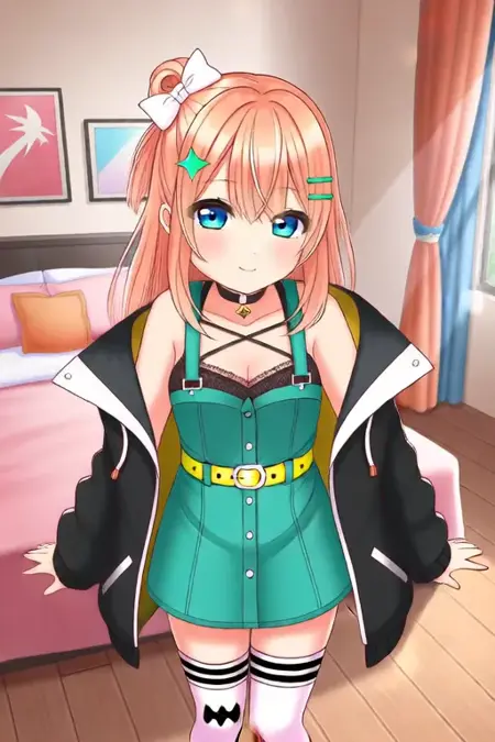 示例提示词:Igarashi Rika, anime-style girl。图像为一位动漫风格角色,拥有长及束成高发髻的浅橙色头发,发髻上装饰有白色蝴蝶结和黄色星星状发饰。角色拥有大而富有表现力的蓝色眼睛,略带闪烁感。她佩戴一条黑色项圈,配小吊坠;身穿绿色背带工装裤,搭配黄色猫形扣腰带。服装还包括白色领饰及橙黑相间的外套,带有白色兜帽。角色穿着黑色条纹及膝袜,脚穿带有星星装饰的白色鞋子。(她正在跳霹雳舞:3.5),在卧室中。
