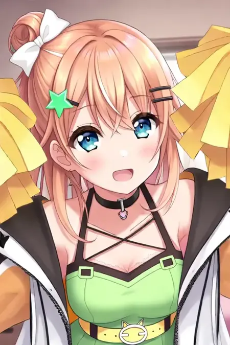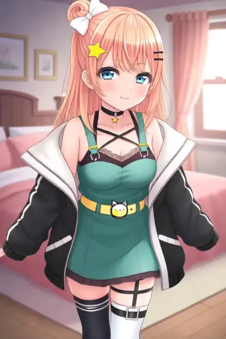 示例提示词:Igarashi Rika, anime-style girl。图像为一位动漫风格角色,拥有长及束成高发髻的浅橙色头发,发髻上装饰有白色蝴蝶结和黄色星星状发饰。角色拥有大而富有表现力的蓝色眼睛,略带闪烁感。她佩戴一条黑色项圈,配小吊坠;身穿绿色无袖上衣,搭配黄色猫形扣腰带。服装还包括白色领饰及带有白色兜帽的黑色外套。角色穿着黑色条纹及膝袜,脚穿带有星星装饰的白色鞋子。(她正在跳舞:2.5),(Q版Nendoroid:3.5),在卧室中。