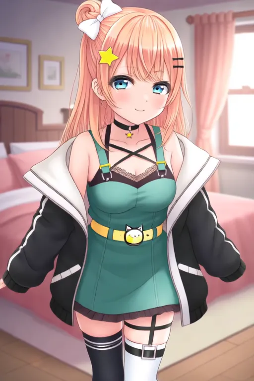 触发词:Igarashi Rika, anime-style girl。图像为一位动漫风格角色,拥有长及束成高发髻的浅橙色头发,发髻上装饰有白色蝴蝶结和黄色星星状发饰。角色拥有大而富有表现力的蓝色眼睛,略带闪烁感。她佩戴一条黑色项圈,配小吊坠;身穿绿色无袖上衣,搭配黄色猫形扣腰带。服装还包括白色领饰及带有白色兜帽的黑色外套。角色穿着黑色条纹及膝袜,脚穿带有星星装饰的白色鞋子。