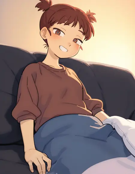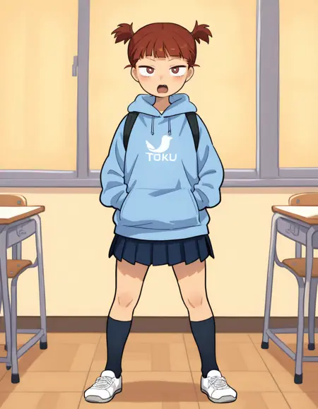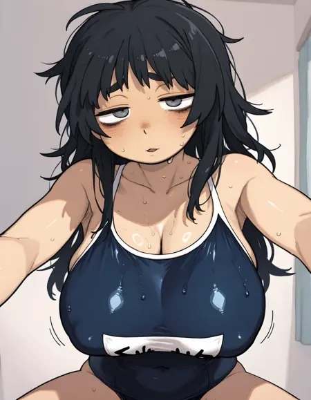 Tanukihara: tanu, 신발, 검은 머리, 스니커즈, 단발머리, 트랙 팬츠, 검은 눈, 어지러운 머리, 긴 소매, 큰 가슴, 트랙복, 두꺼운 눈썹