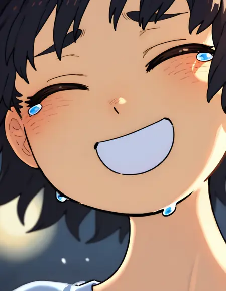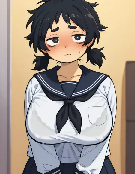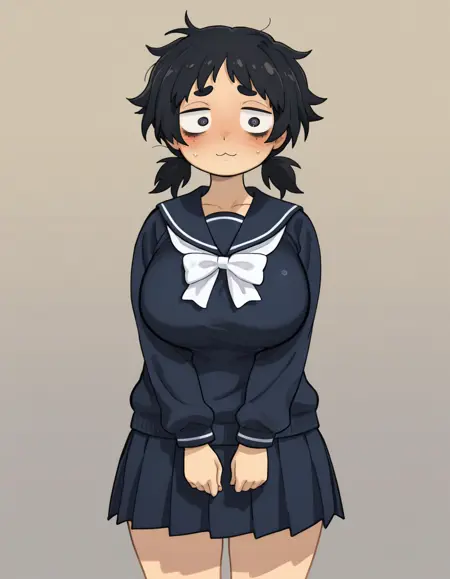 tanu, shoes, black hair, sneakers, short_hair, track_pants, black_eyes, messy hair, long sleeves, large_breasts, tracksuit,thick eyebrows