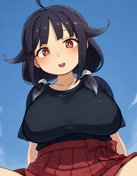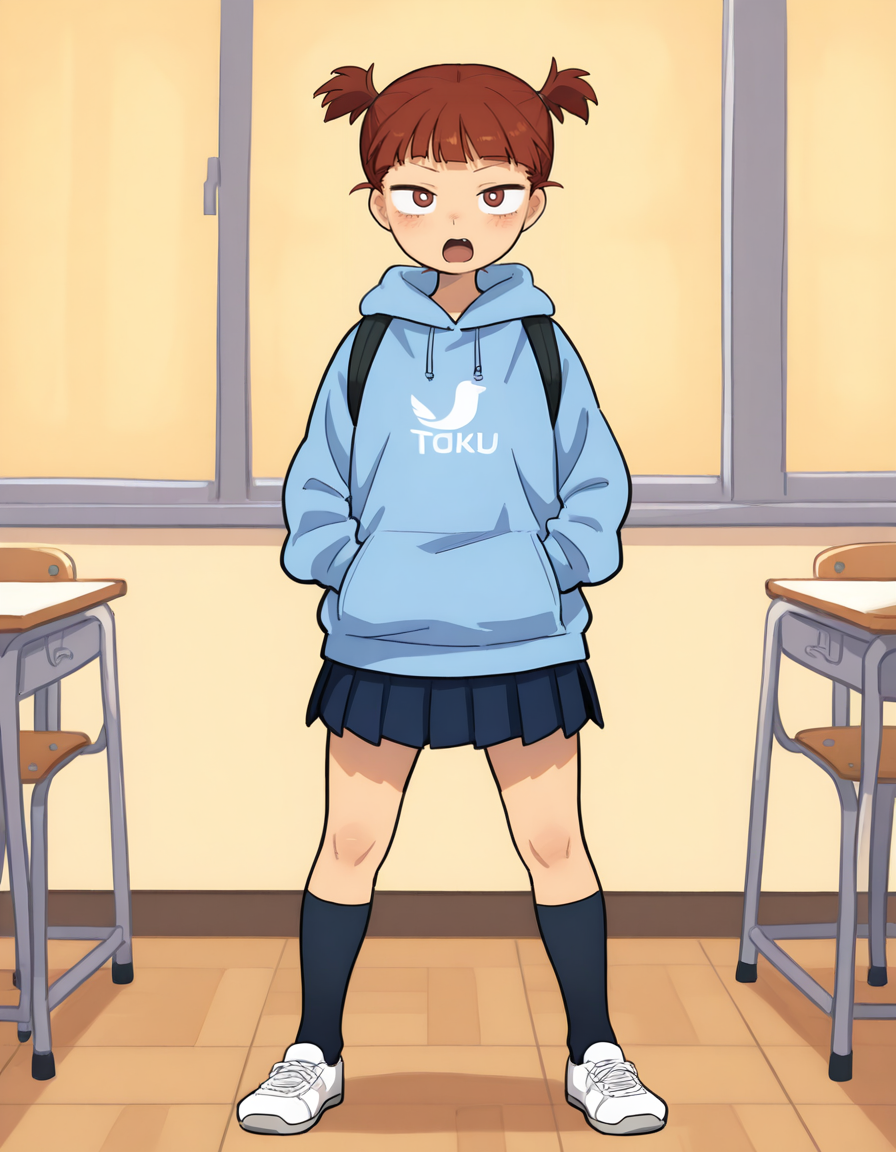 mikkodef, red_hair, short_twintails, pleated_skirt, track_jacket, miniskirt, red_eyes, keizoku_military_uniform, hair_tie, short_hair, raglan_sleeves, blunt_bangs, zipper, eyebrows_visible_through_hair