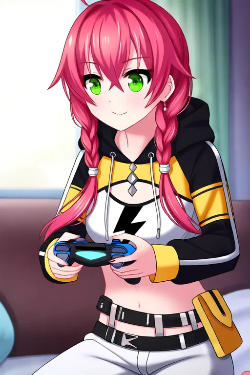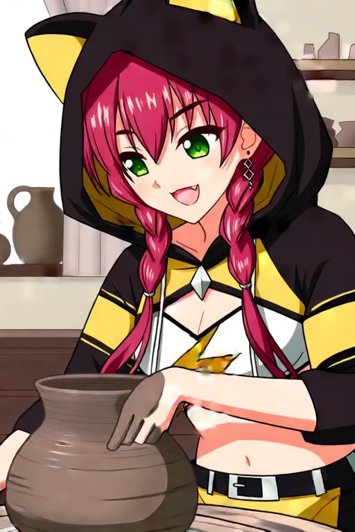 Trigger Word:Shishidou Akari, anime-style girl. The image depicts an anime-style character with red hair styled in two braids that fall over her shoulders. Her eyes are green, and she is wearing a black hoodie with cat ears on the hood. The hoodie is paired with a yellow crop top underneath, which is tied at the waist with a belt. She also wears white pants with yellow cuffs.