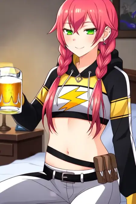 sample prompt:Shishidou Akari, anime-style girl. The image depicts an anime-style character with red hair styled in two braids that fall over her shoulders. Her eyes are green, and she is wearing a black hoodie with cat ears on the hood. The hoodie is paired with a yellow crop top underneath, which is tied at the waist with a belt. She also wears white pants with yellow cuffs. (she is dancing:4.0), (chibi Nendoroid:4.5) in bedroom.