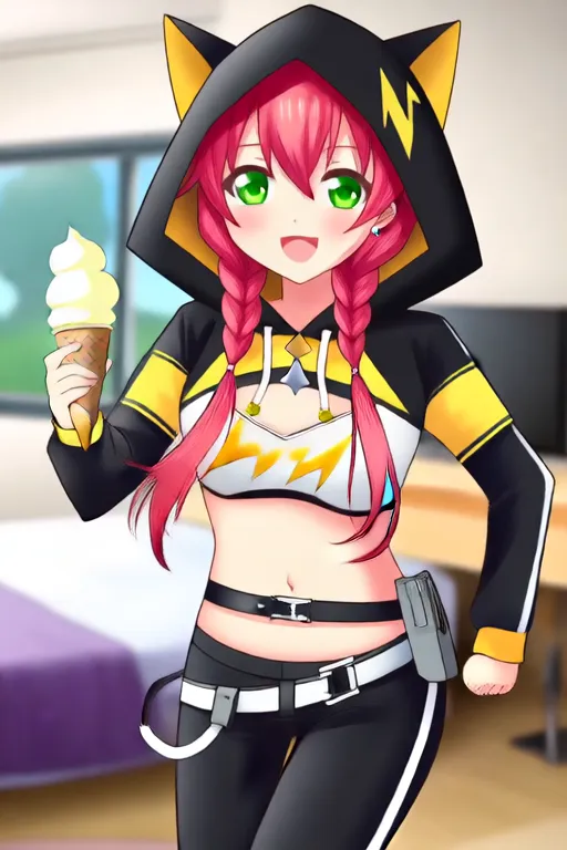 Trigger Word:Shishidou Akari, anime-style girl. The image features an animated character with vibrant red hair styled in two braids. The character has green eyes and is wearing a cat ear hooded outfit. She is wearing a black and yellow outfit with a white top that has a lightning bolt design. The outfit includes a belt around the waist and a pair of pants,