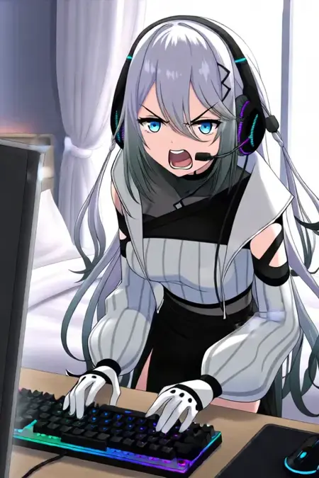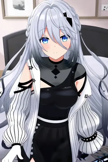 トリガーワード: Sophia Valentine、アニメスタイルの女の子。画像には、腰まで流れ下がる長く流れる銀髪のアニメスタイルのキャラクターが描かれています。髪はゆるやかなウェーブで整えられ、柔らかくエレガントな印象を与えています。キャラクターは、薄い肌に映える鮮やかな青い目を持っています。キャラクターは、高めの襟と短い袖を持つブラック&ホワイトのストライプトップと、膝上まで届くブラックスカートを着ています。腕には黒いアクセントが施された白い手袋を着用しています。