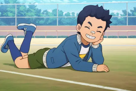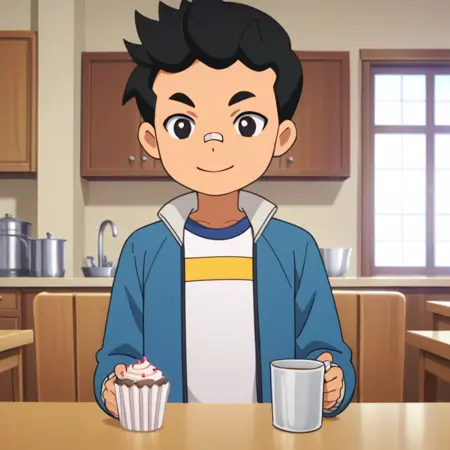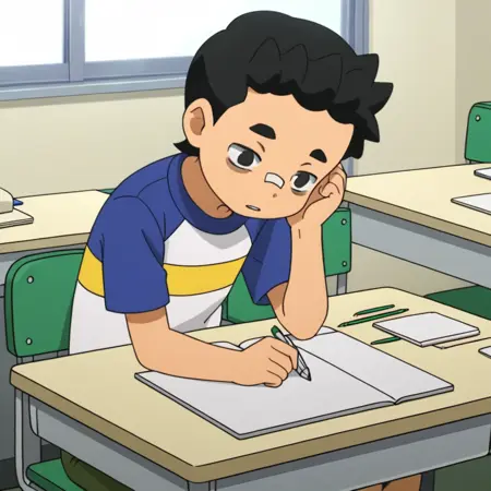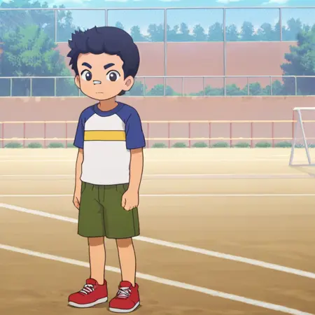 Prompts: male, male child, child, black hair, black eyes, bandaid on nose, t-shirt, raglan sleeves, shorts, red sneakers, indoors (classroom/school desk/chair/chalkboard/cabinet/window/curtains), indoors (kitchen/table/door/cup/cupcake/plate), outdoors (soccer field/sky/cloud/soccer goal/tree/brick wall/fence/building behind fence)
