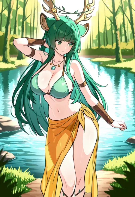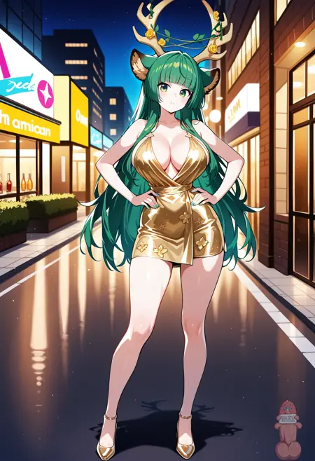 合格词:鹿耳、齐刘海、动物耳朵绒毛、非常长的头发、绿色眼睛、绿色头发、1个女孩、鹿角、大乳房、驯鹿角、绿色鹿尾,