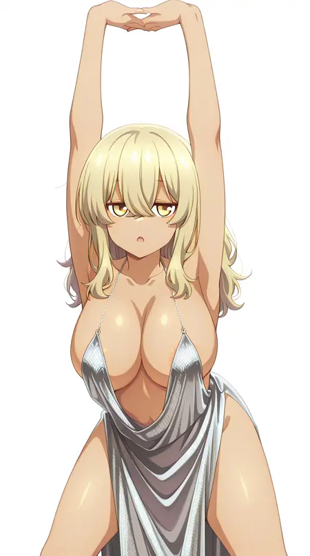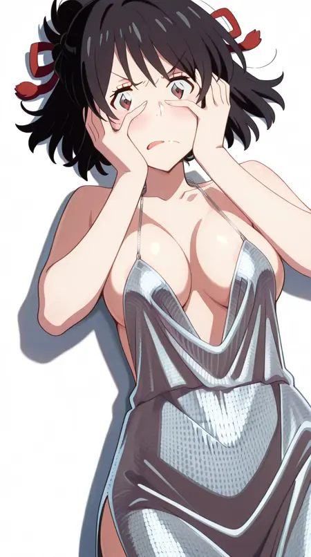 lora:luxurious-wheels-illustriousxl-lora-nochekaiser:1, luxurious wheels, st. louis (azur lane) (코스프레), 은색 드레스, 컬 넥, 이브닝 드레스, 깊은 네크라인, 가슴, 데클레브, 어깨 노출, 할터 드레스, 등이 드러난 드레스, 언더부브, 사이드부브, 아레올라, 야외, 도시 풍경, 거리, 밤, 달, 스포츠카, 몸을 굽힌 자세, 미소, 붉은 뺨, 카우보이 샷, 덴치 앵글,