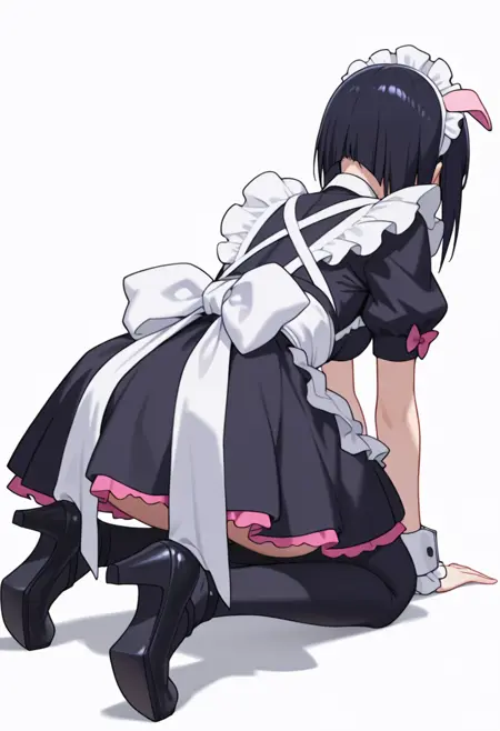 maid, maid headdress, maid apron, black dress, puffy short sleeves,black thighhighs, high heels, wrist cuffs,pink bowtie, frills,