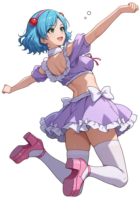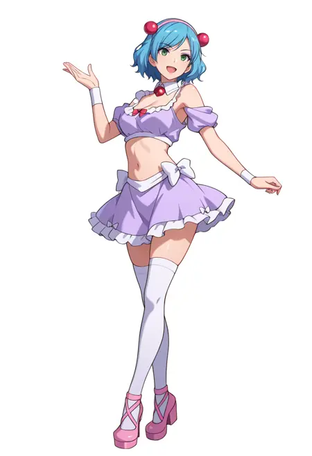 dress, white dress, leotard, skirt,maid headdress, short sleeves, puffy sleeves, single thighhigh, red shoes,white ribbon, clothing cutout, cleavage cutout,