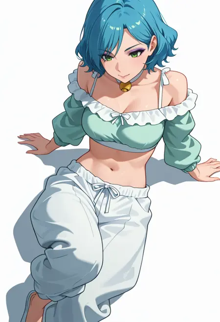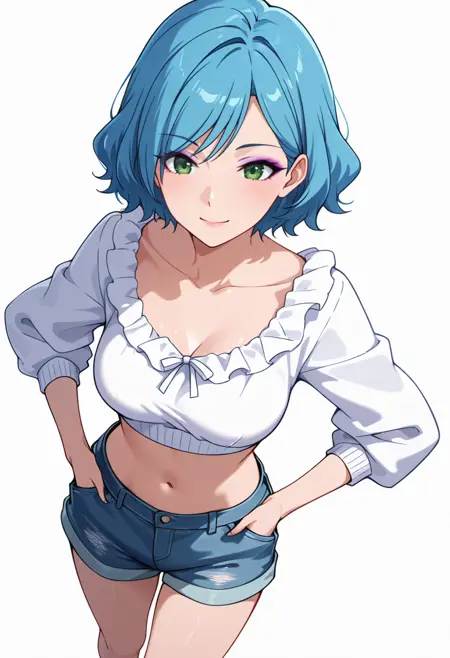 manami_cnr, 1girl,blue hair, long hair, blunt bangs, green eyes, makeup, lipstick,white flower,hair flower, hair ornament,
