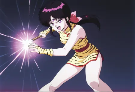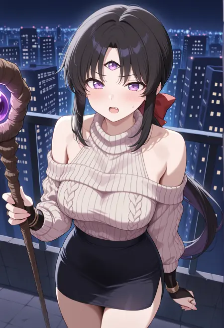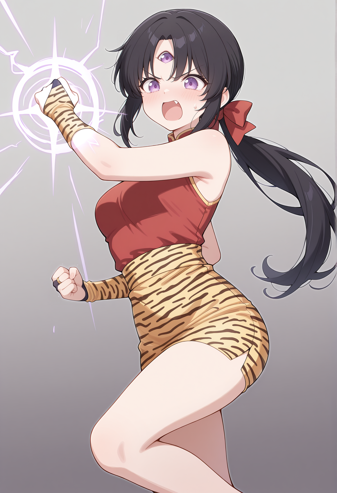 : 黒髪、長い髪、側髪、低めのポニーテール、第三の目