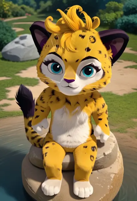 yellow fur, black spots, white paws, white belly, white face, yellow hair, short hair, blue eyes, eyelashes, dark ears, small nose, dark purple nose, long tail, yellow tail, four fingers on arms