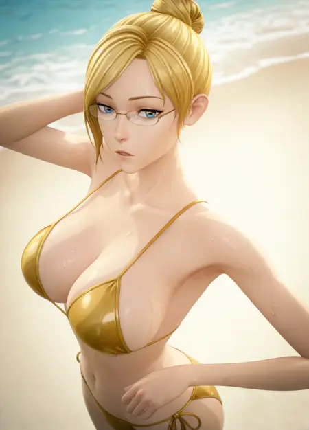 juan1, 1girl,blue eyes, solo, blonde hair, jewelry, earrings, sleeveless, short hair, breasts, bracelet, dress, blue dress, bare shoulders,single hair bun, hair bun,large breasts,
