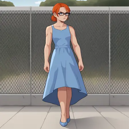 옵션: 안경, 파란 눈, 주황색 머리카락, 파란 자켓, 보라색 후디, 찢어진 청바지, 손가락 없는 장갑
