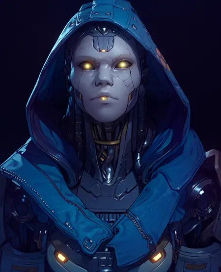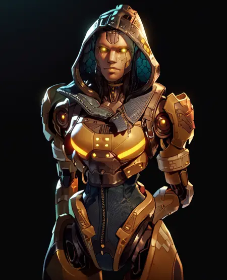 模型可能会给她生成真实头发——若保留兜帽,可尝试在 Neg 中加入 hair,或在提示中加入 robotic dreads,