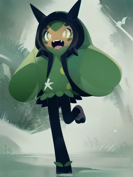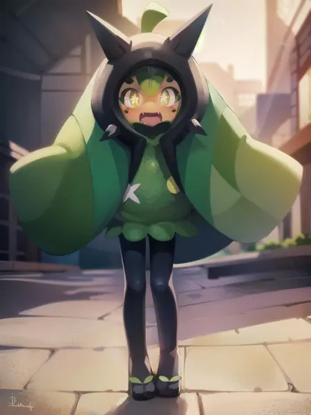 Ogerpon Tags: ogerpon, pokemon \(creature\) | personification, yellow eyes, teal | red | blue | grey cloak, teal | hearthflame | wellspring | cornerstone mask