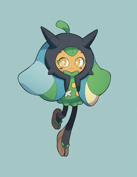 拟人化标签: ogerpon,黑色角,黄色眼睛,星形瞳孔,明亮瞳孔,扇子