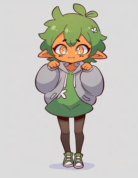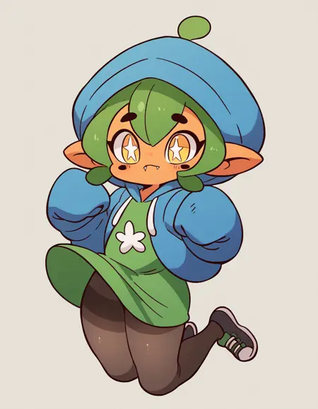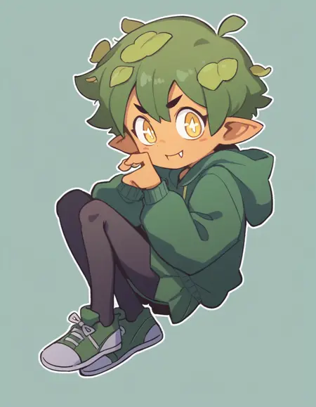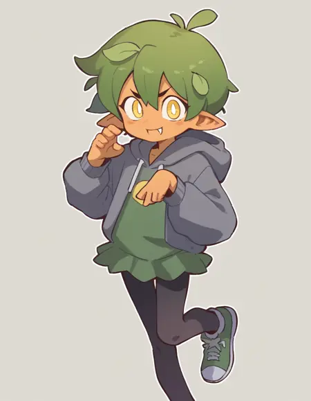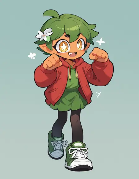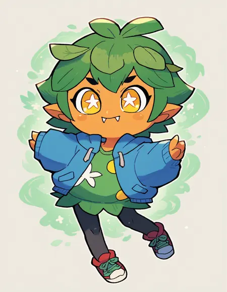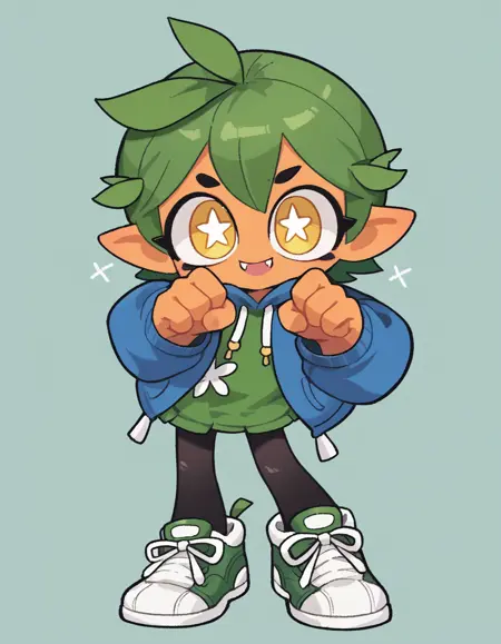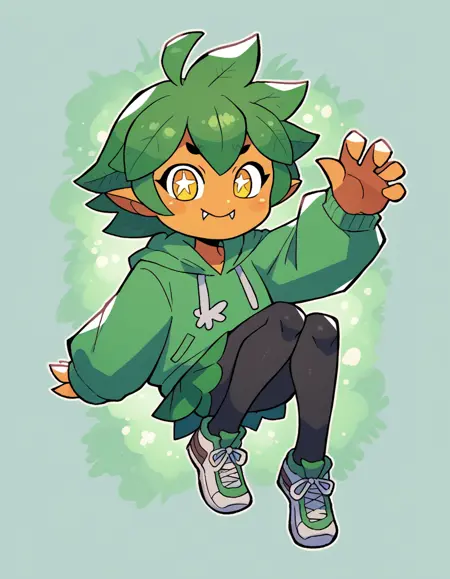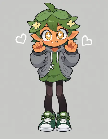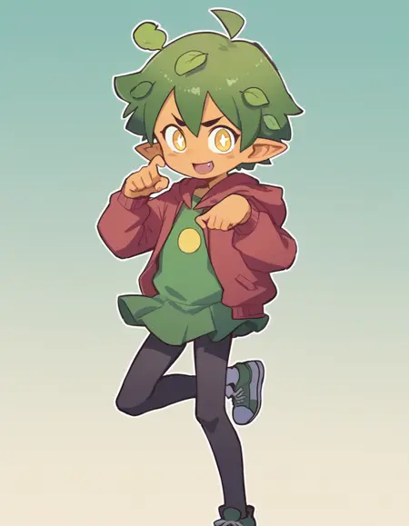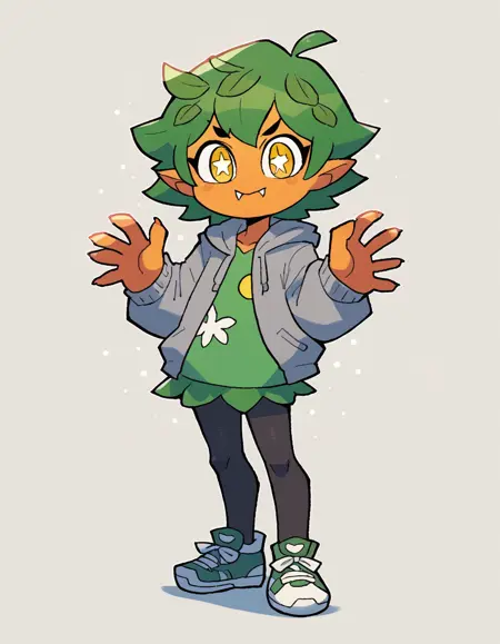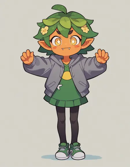 Gijinka Tags: ogerpon, black horns, yellow eyes, star-shaped pupils, bright pupils, fan