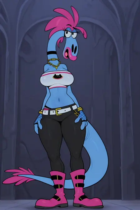 SYLV14, sylvia \(wander over yonder\), solo, female, feral, semi-anthro, alien, zbornak, blue skin, blue body, red hair, eyebrows, eyelashes, snout, 3 fingers, tail, tail fin, long neck, long tail, 2 toes, bridle, saddle,