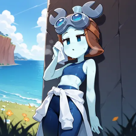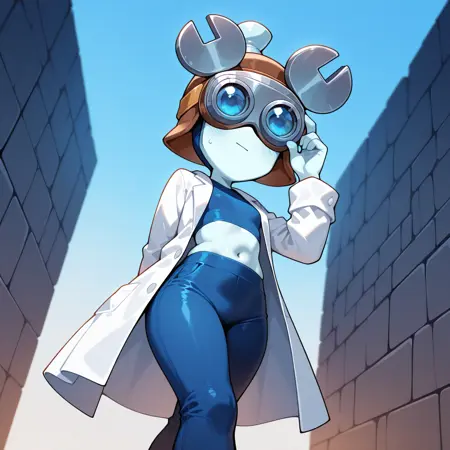 갈색 모자, 흰색 실험복, 파란색 크롭탑, 복부 노출, 파란색 바지